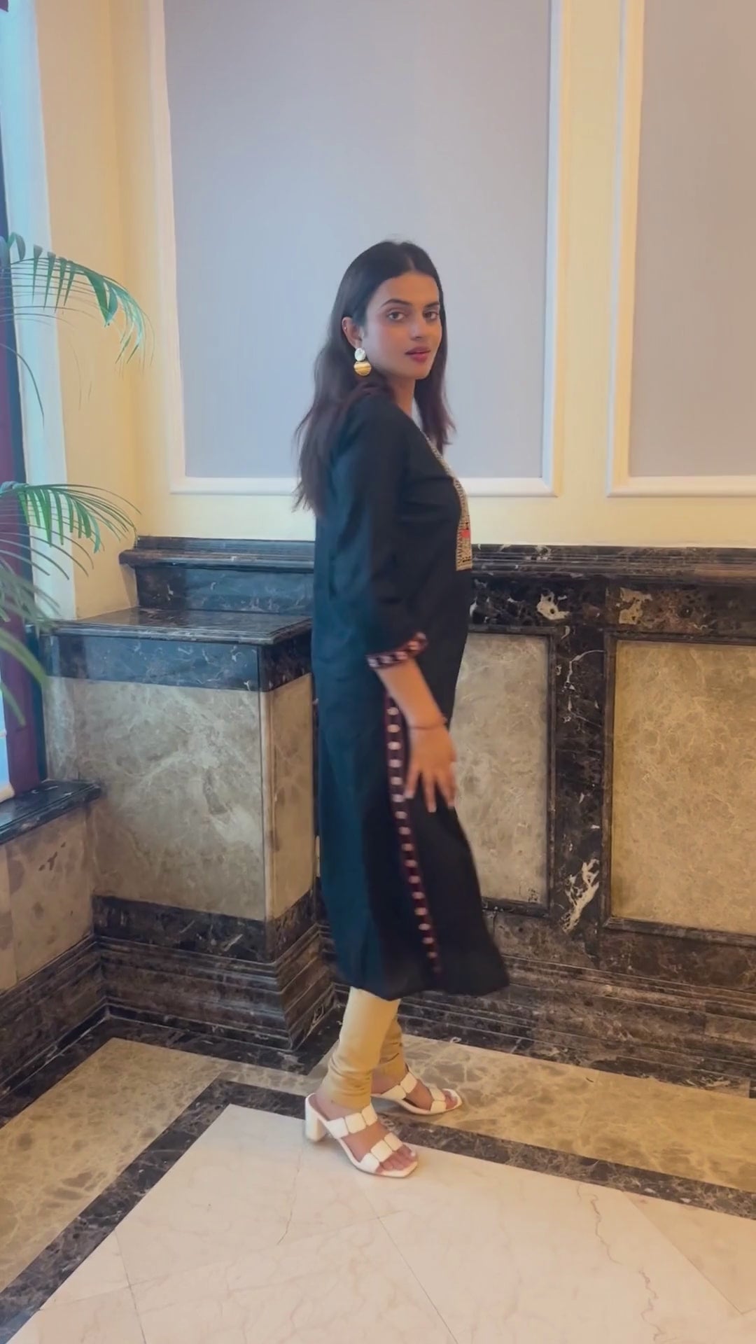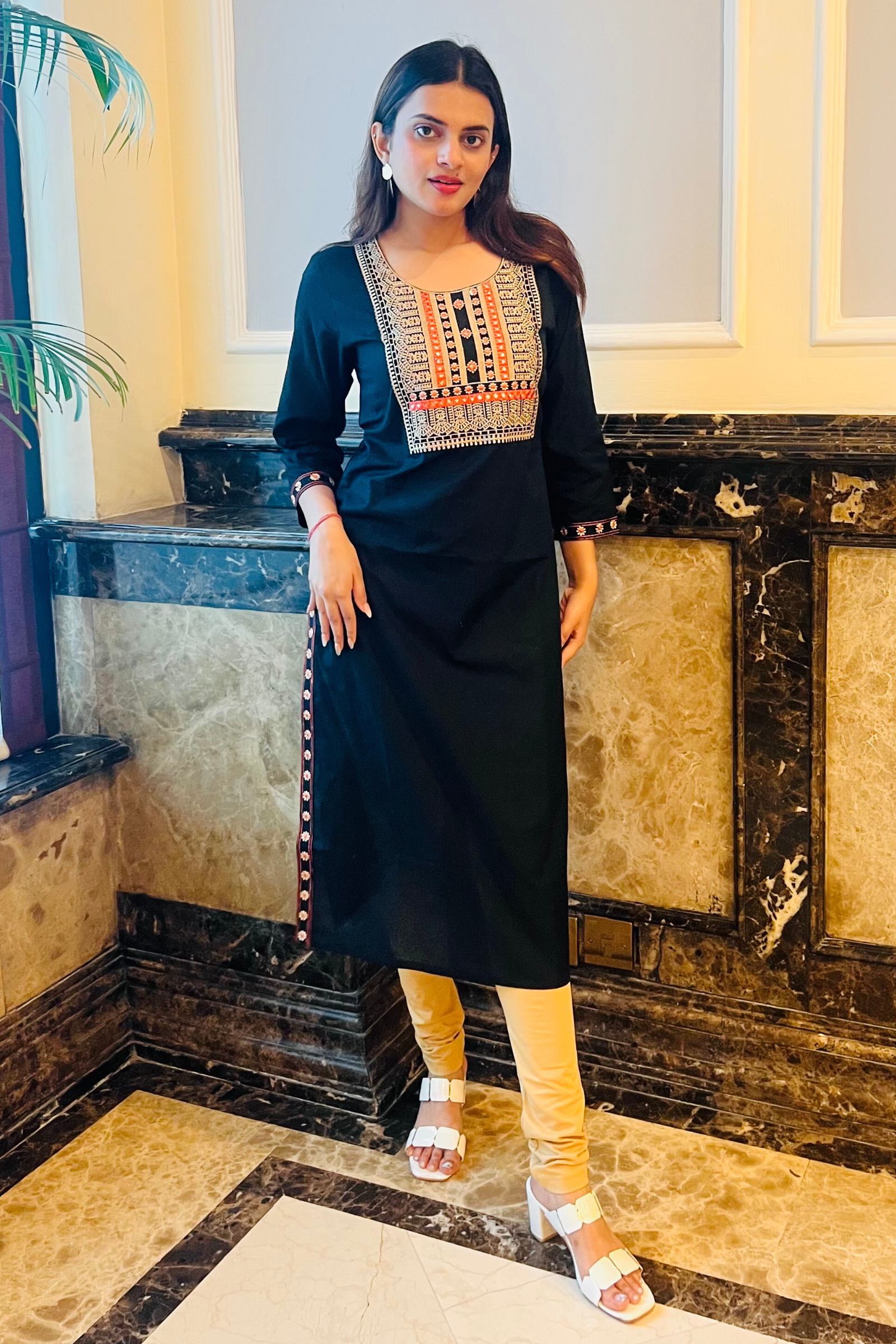 This Premium cotton straight fit kurta with intricate thread embroidery on neck line comes in two color navy & black.