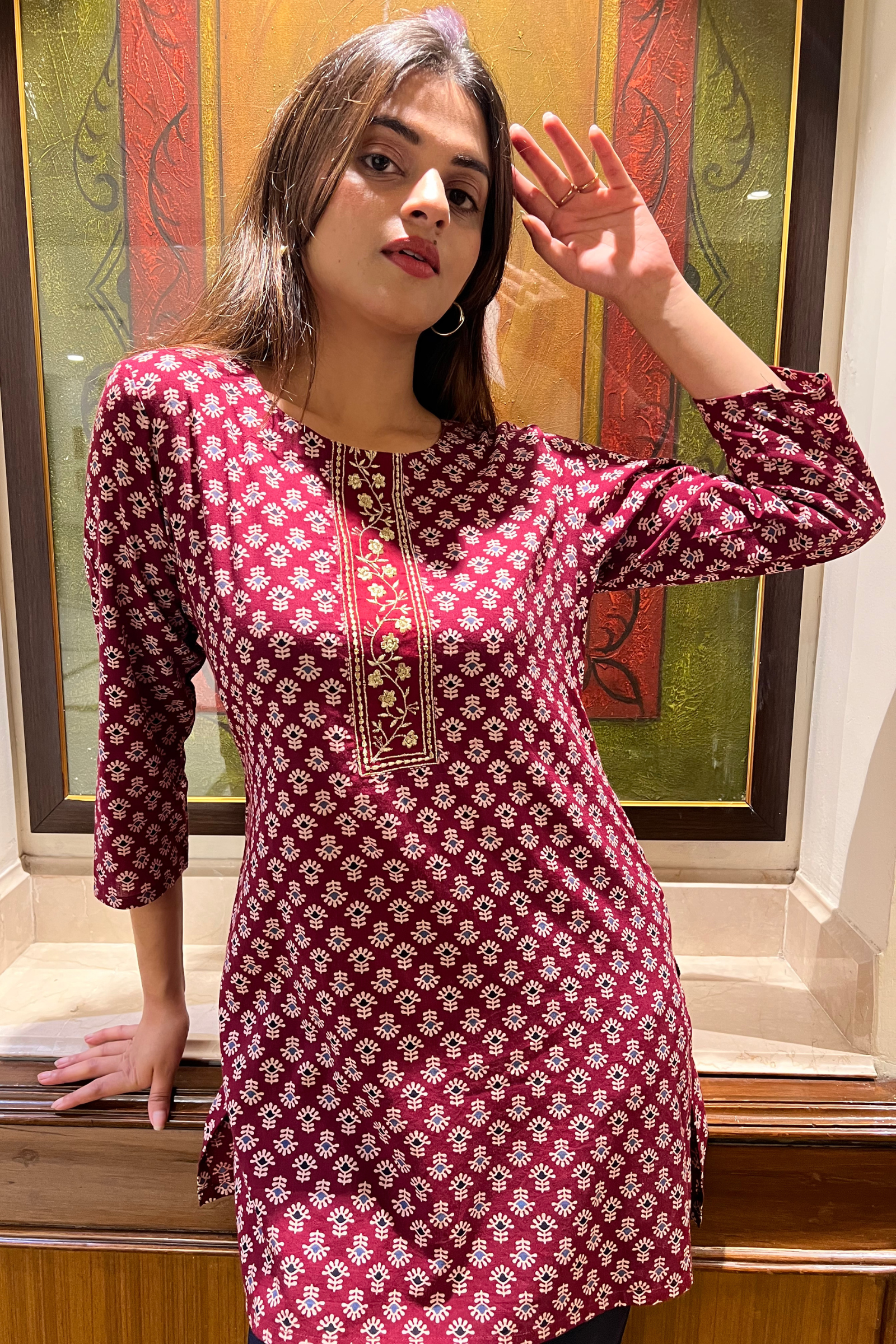 Beautiful ajrak print in maroon color crafted in soft cotton short kurti with zari embroidery on the neck panel.