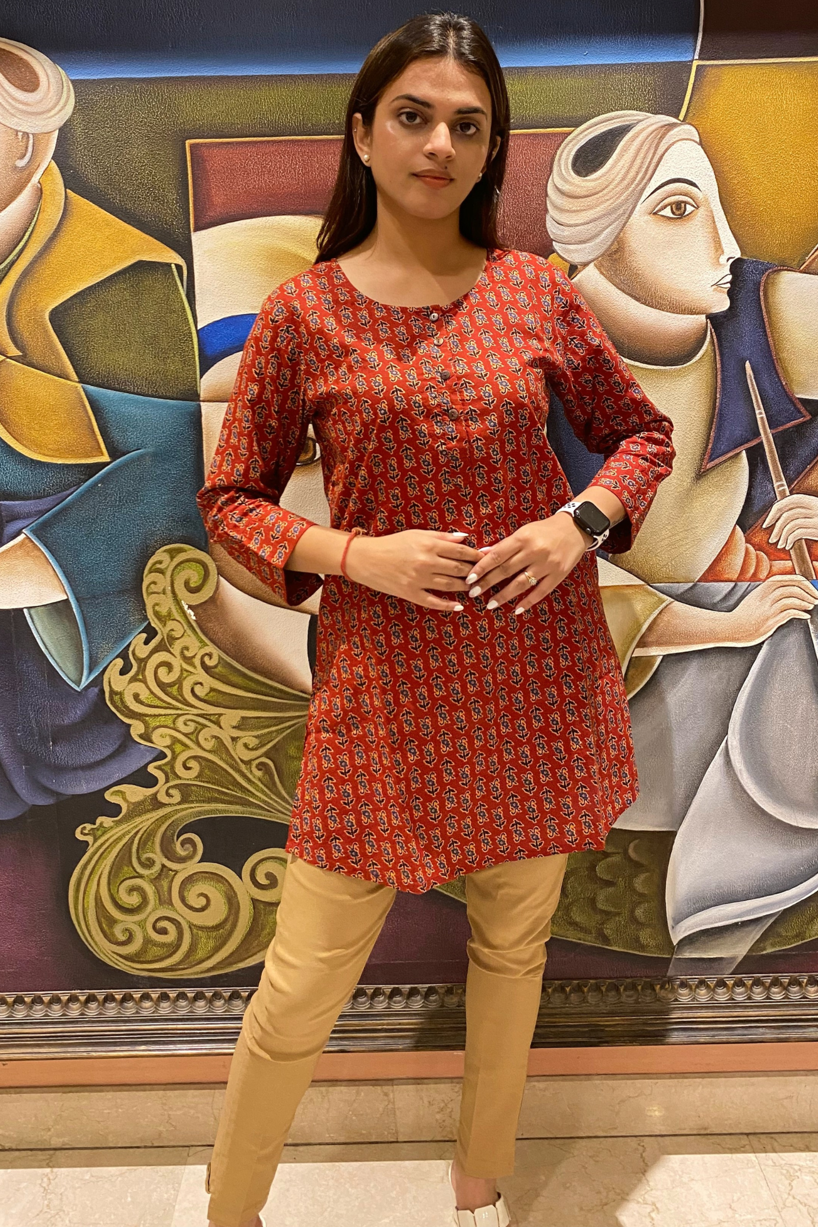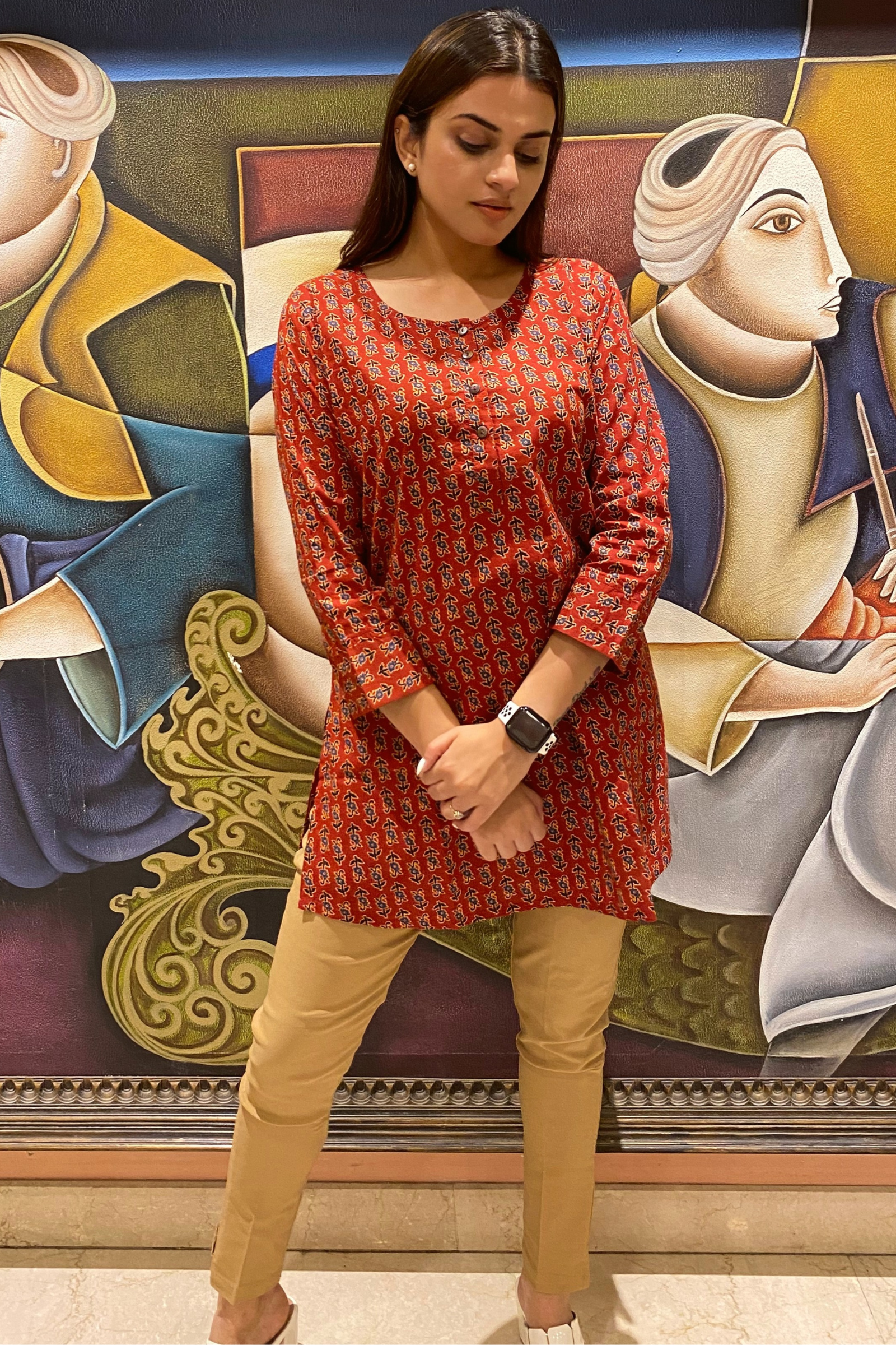 This Short Kurti (top) comes in elegant cotton print with detailing on neck line & cuff.