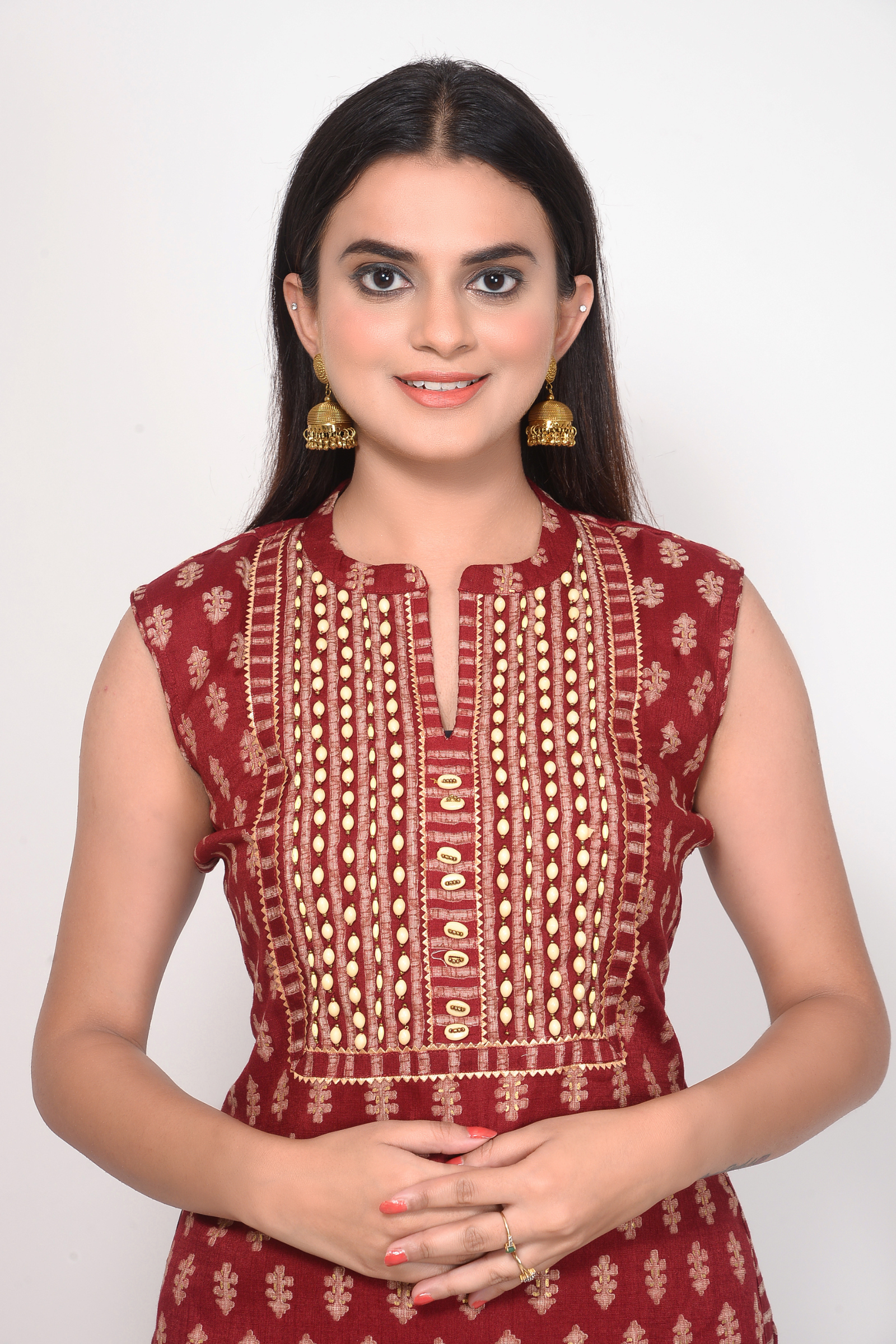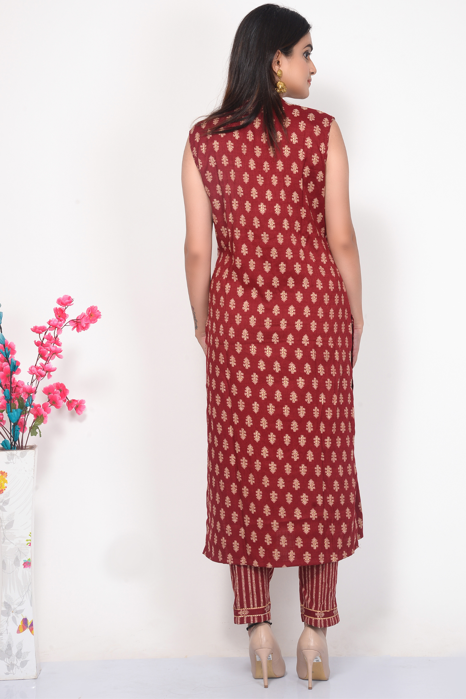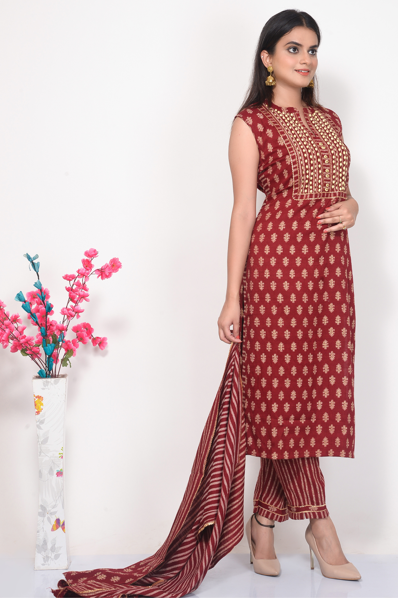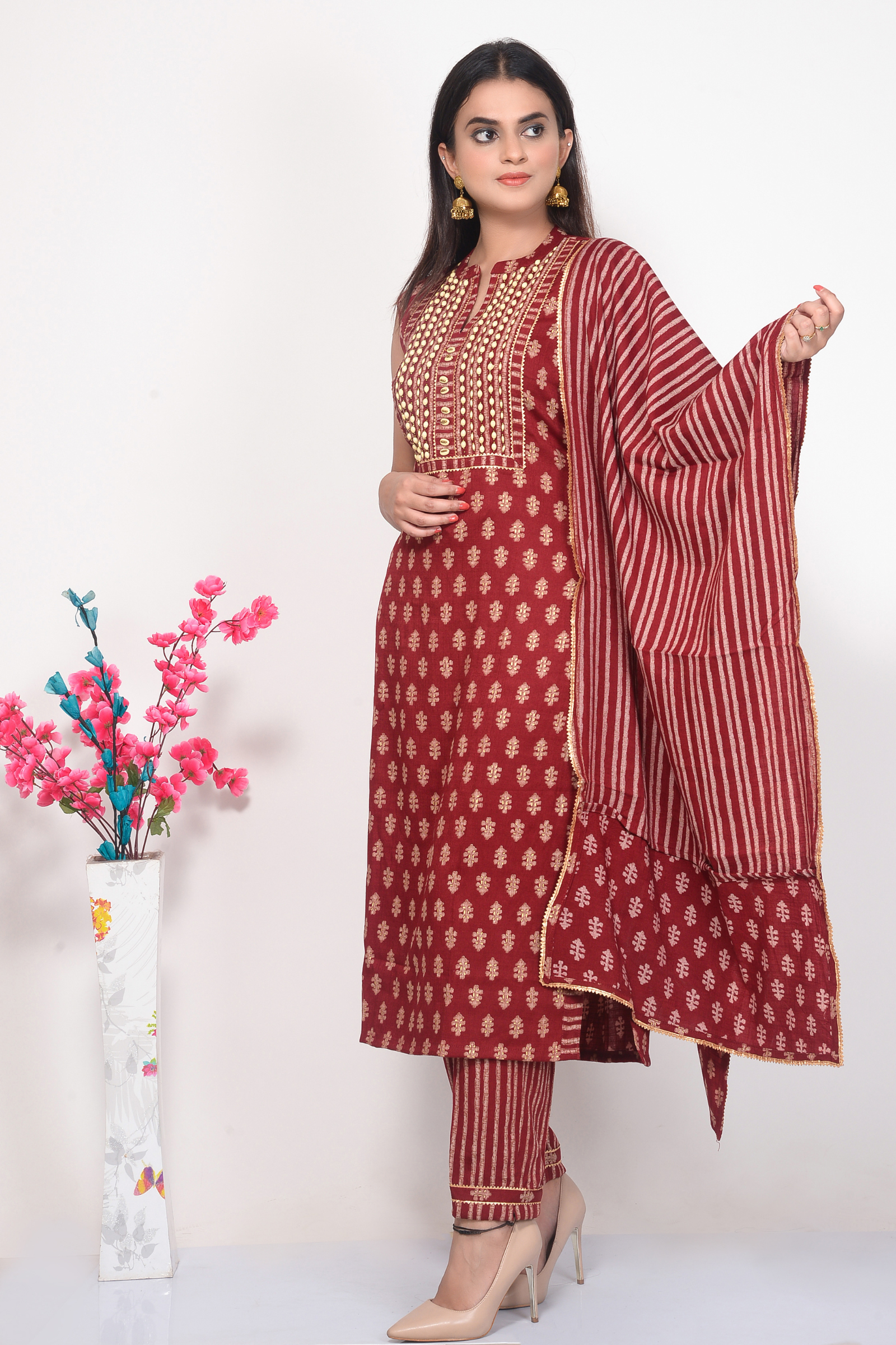 Beautiful Stylish Stone Hand Embroidery on Neck. Rayon Printed Maroon Kurta along with matching Dupatta & Pant.