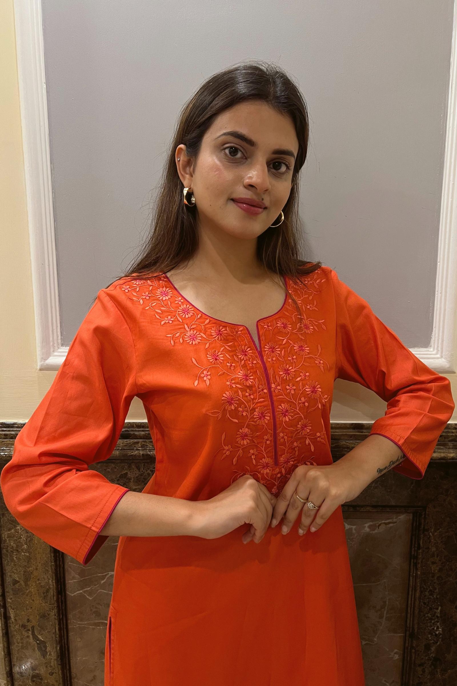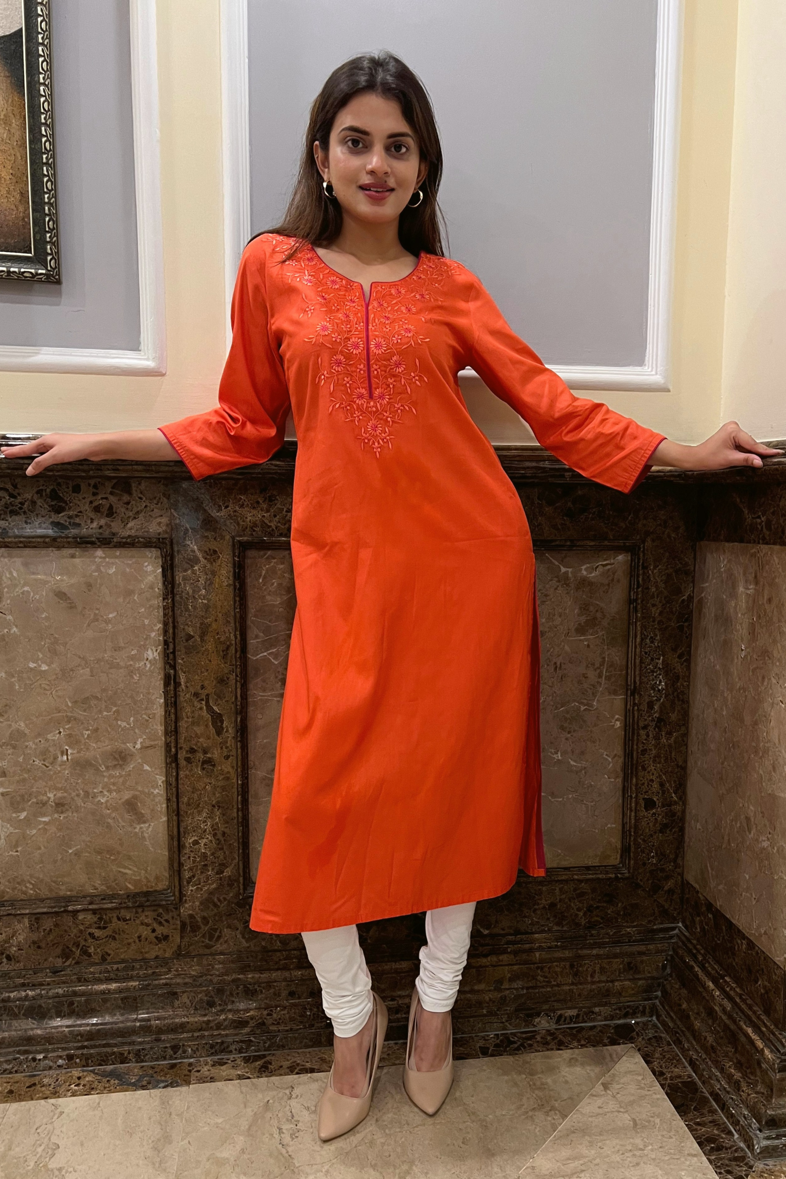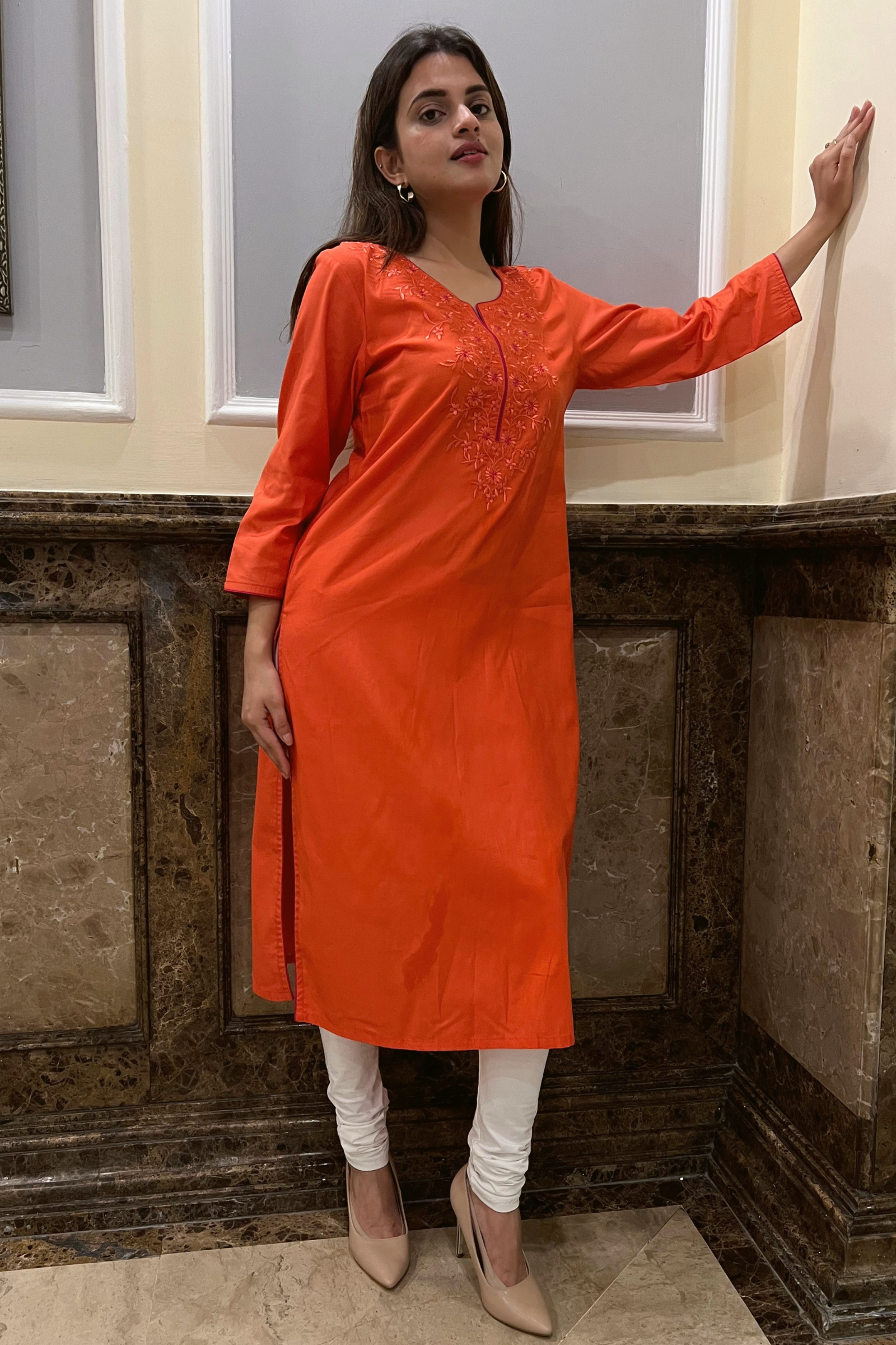 Elegant Straight fit kurta with matching embroidery comes in two colors yellow & carrot.
